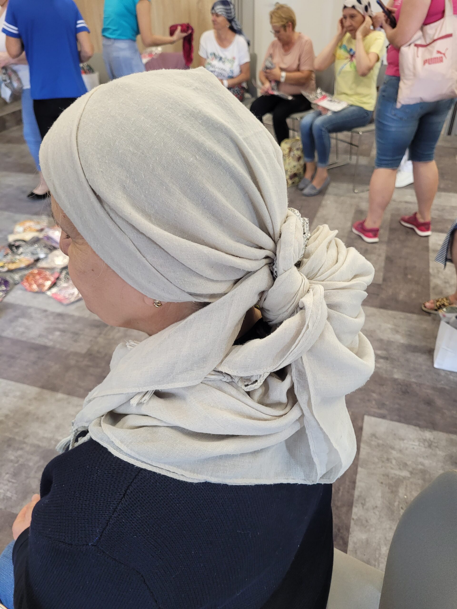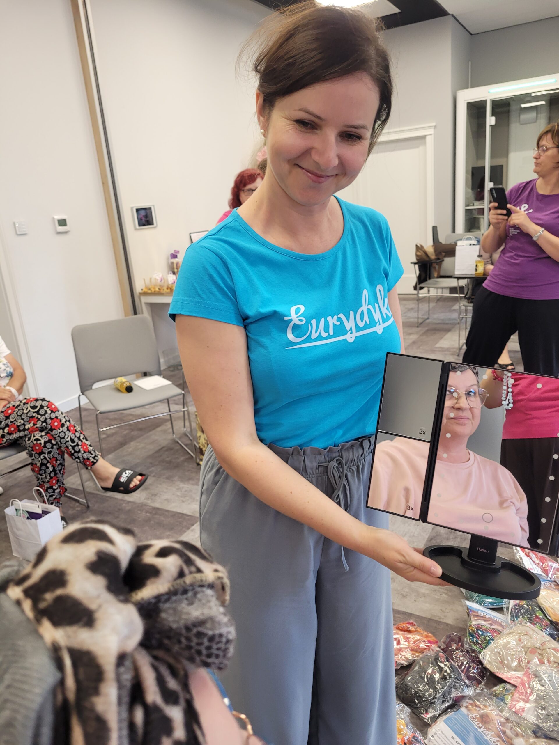 Podczas warsztatu uczymy, jak zamienić chustę w kolorową ozdobę, jak dobrać ją do typu urody, a także jak wykonać delikatny makijaż, który podkreśli naturalne piękno. Każda kobieta podczas warsztatu otrzymuje w prezencie trzy różne onkochusty , zaprojektowane i uszyte z sercem przez wolontariat Stowarzyszenia Eurydyki we współpracy z pracownią krawiecką „Joanna”